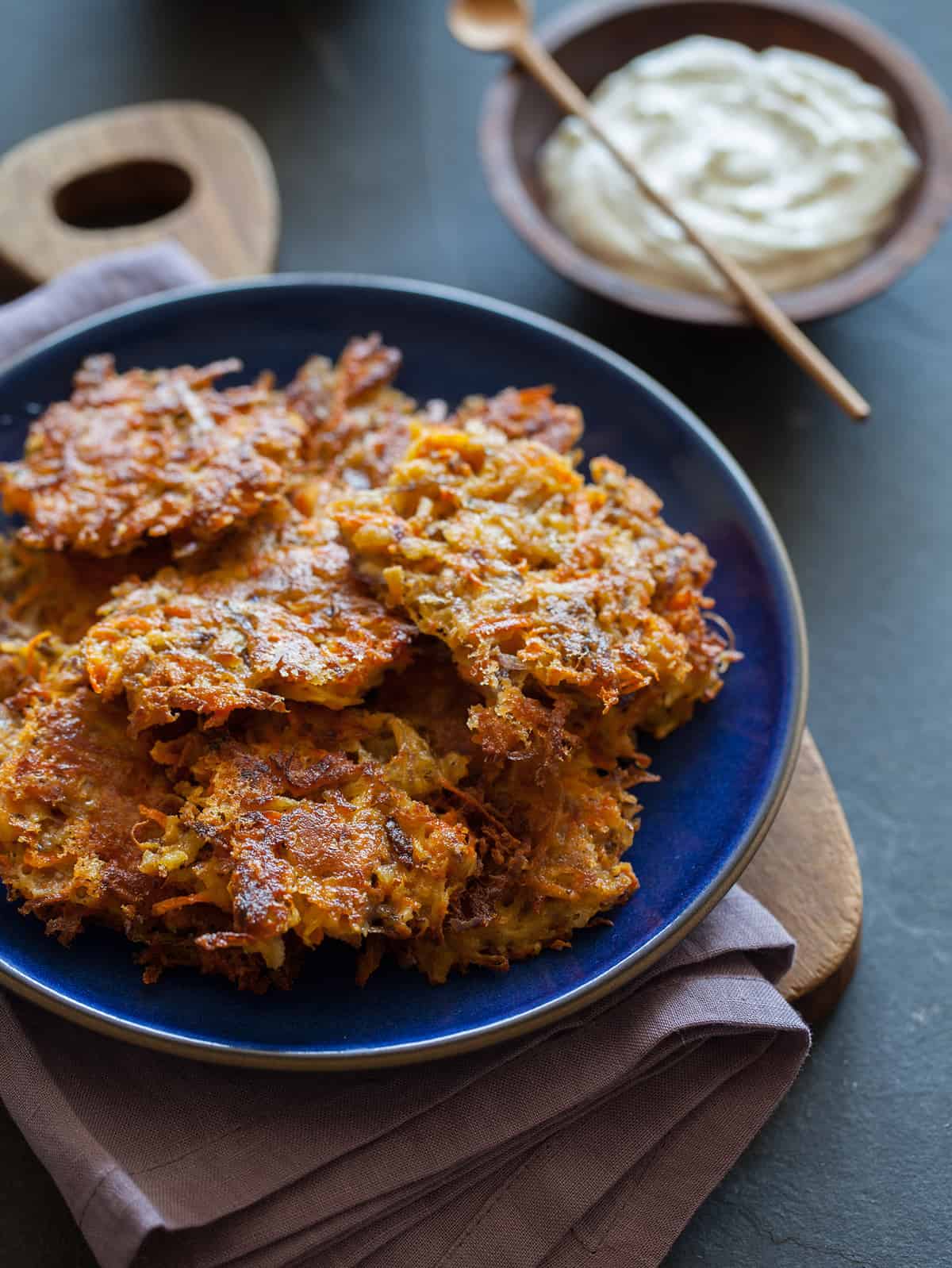 #Vegetable | These Root Vegetable Fritters are made with carrots, potatoes, and parsnips, then served with sour cream.